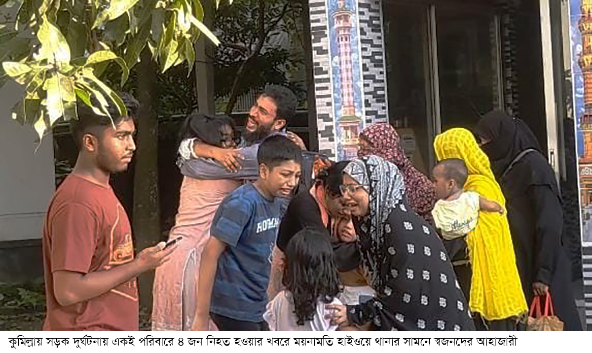 কুমিল্লায় ব্যস্ততম মহাসড়কে ঝুঁকিপূর্ণ একটি ইউটার্নে প্রাইভেটকারের ওপর সিমেন্ট বোঝাই কাভার্ডভ্যান উল্টে পড়ে স্বামী স্ত্রীসহ একই পরিবারের ৪ জন নিহত হন। শুক্রবার রাত ১১টার দিকে জেলার বরুড়া উপজেলার পয়ালগাছা ইউনিয়নের হোসেনপুর বেপারী বাড়ির পারিবারিক কবরস্থানে বাবা মা ও তাদের ২ সন্তানকে পাশাপাশি দাফন হয়েছে। এর আগে স্থানীয় হোসেনপুর কেন্দ্রীয় জামে মসজিদ প্রাঙ্গণে জানাজার নামাজ অনুষ্ঠিত হয়। এতে এলাকার সর্বস্তরের লোকজন অংশ নেয়। একই পরিবারের চার জনের মৃত্যুর খবরে এলাকায় শোকের ছায়া নেমে এসেছে।