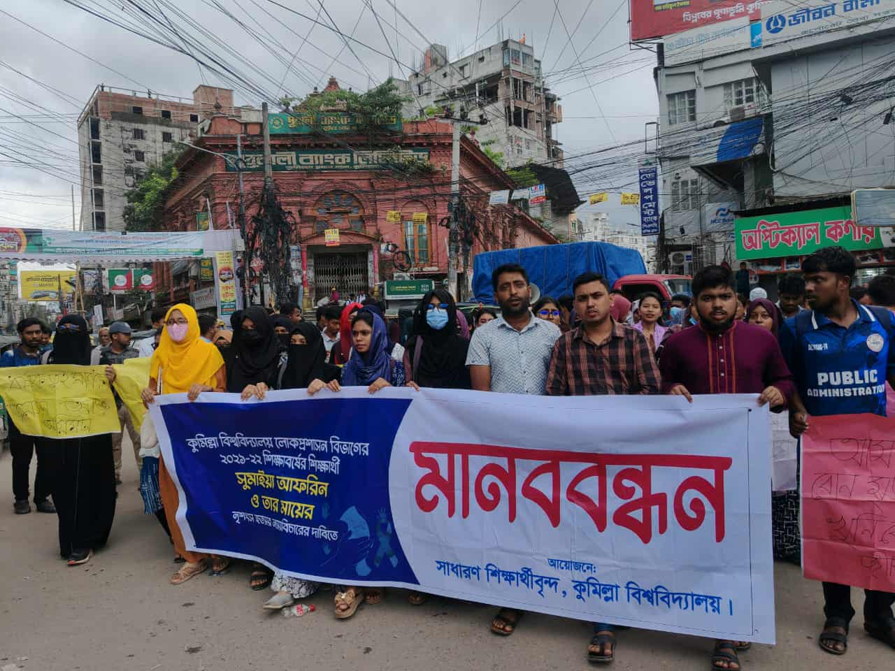 কুমিল্লা বিশ্ববিদ্যালয়ের লোক প্রশাসন বিভাগের ২০২১–২২ শিক্ষাবর্ষের শিক্ষার্থী সুমাইয়া আফরিন ও তার মায়ের নৃশংস হত্যা এবং ধর্ষণের ঘটনায় দ্রুত ও সুষ্ঠু বিচার ও দোষীর ফাঁসির দাবিতে শিক্ষার্থীরা সোমবার (১৫ সেপ্টেম্বর) দুপুরে তৃতীয়বারের মতো মানববন্ধন ও বিক্ষোভ মিছিল করেছে।