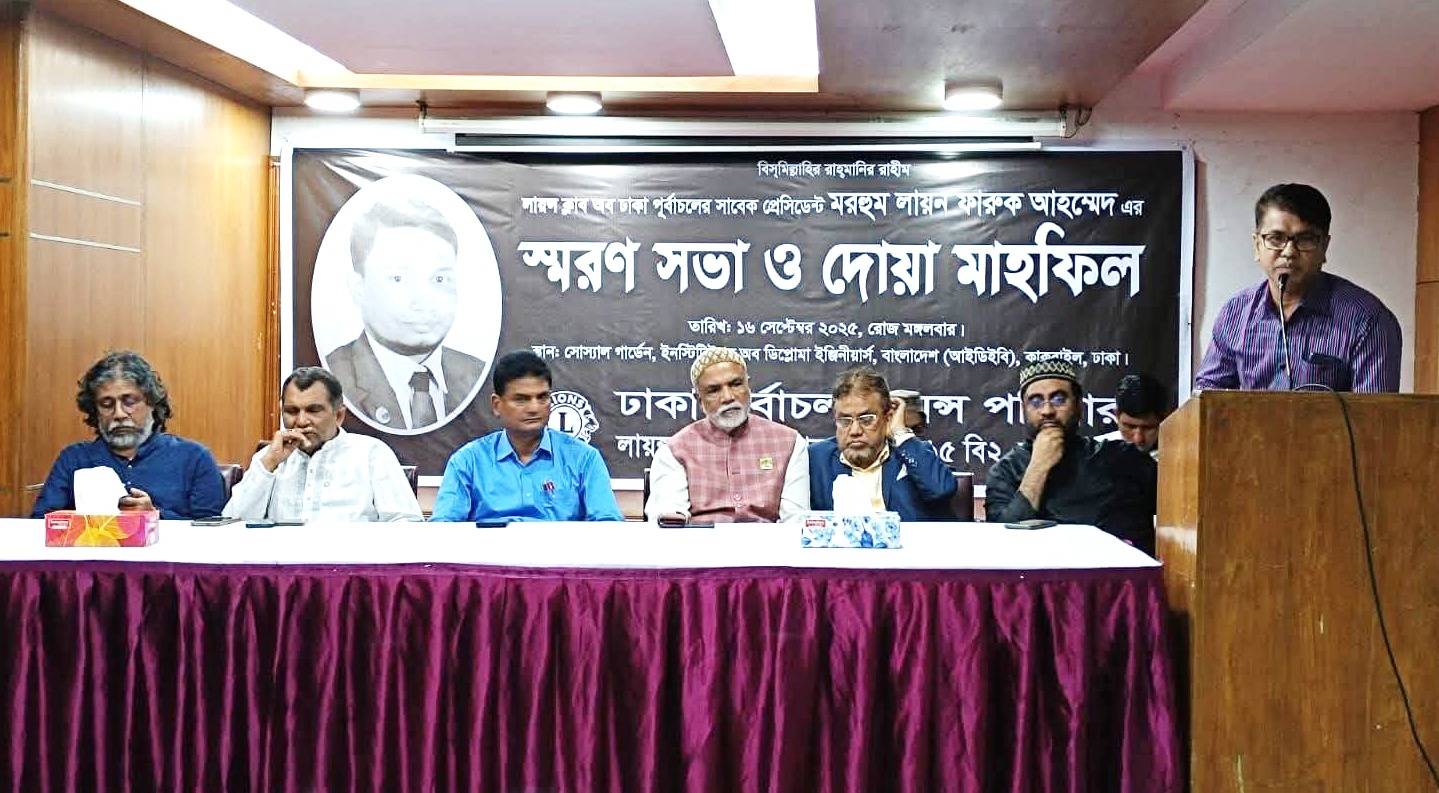 কুমিল্লার মনোহরগঞ্জের কৃতি সন্তান লায়ন্স ক্লাব অব ঢাকা পূর্বাচলের সাবেক প্রেসিডেন্ট মরহুম লায়ন ফারুক আহম্মেদ এর স্মরণ সভা রাজধানীর ইনস্টিটিউশন অব ডিপ্লোমা ইঞ্জিনীয়ার্স (আইডিইবি) ভবনে অনুষ্ঠিত হয়েছে।
