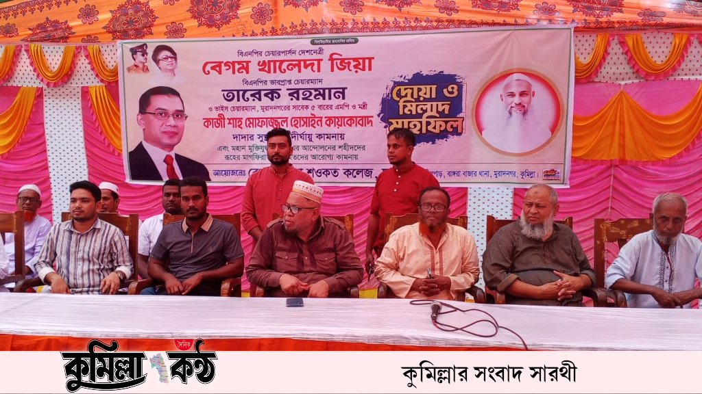কুমিল্লা মুরাদনগরে ৭১ এর মহান মুক্তিযুদ্ধ ও ২৪ এর ছাত্র-জনতার আন্দোলনের শহীদদের মাগফিরাত ও আহতদের আরোগ্য কামনাসহ বিএনপির চেয়ারপার্সন বেগম খালেদা জিয়া, ভারপ্রাপ্ত চেয়ারম্যান তারেক রহমান, ভাইস চেয়ারম্যান ও সাবেক এমপি ও মন্ত্রী কাজী শাহ্ মোফাজ্জল হোসাইন কায়কোবাদ এর সুস্থতা ও দীর্ঘায়ু কামনায় দোয়া ও মিলাদ মাহফিল অনুষ্ঠিত হয়েছে।