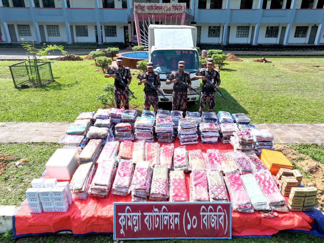 কুমিল্লার সীমান্ত থেকে এক কোটি ৭৪ লাখ টাকা মূল্যের ভারতীয় শাড়ি, মোবাইলের ডিসপ্লেসহ বিপুল পরিমাণ চোরাচালান পণ্য জব্দ করেছে বর্ডার গার্ড বাংলাদেশ (বিজিবি)।
