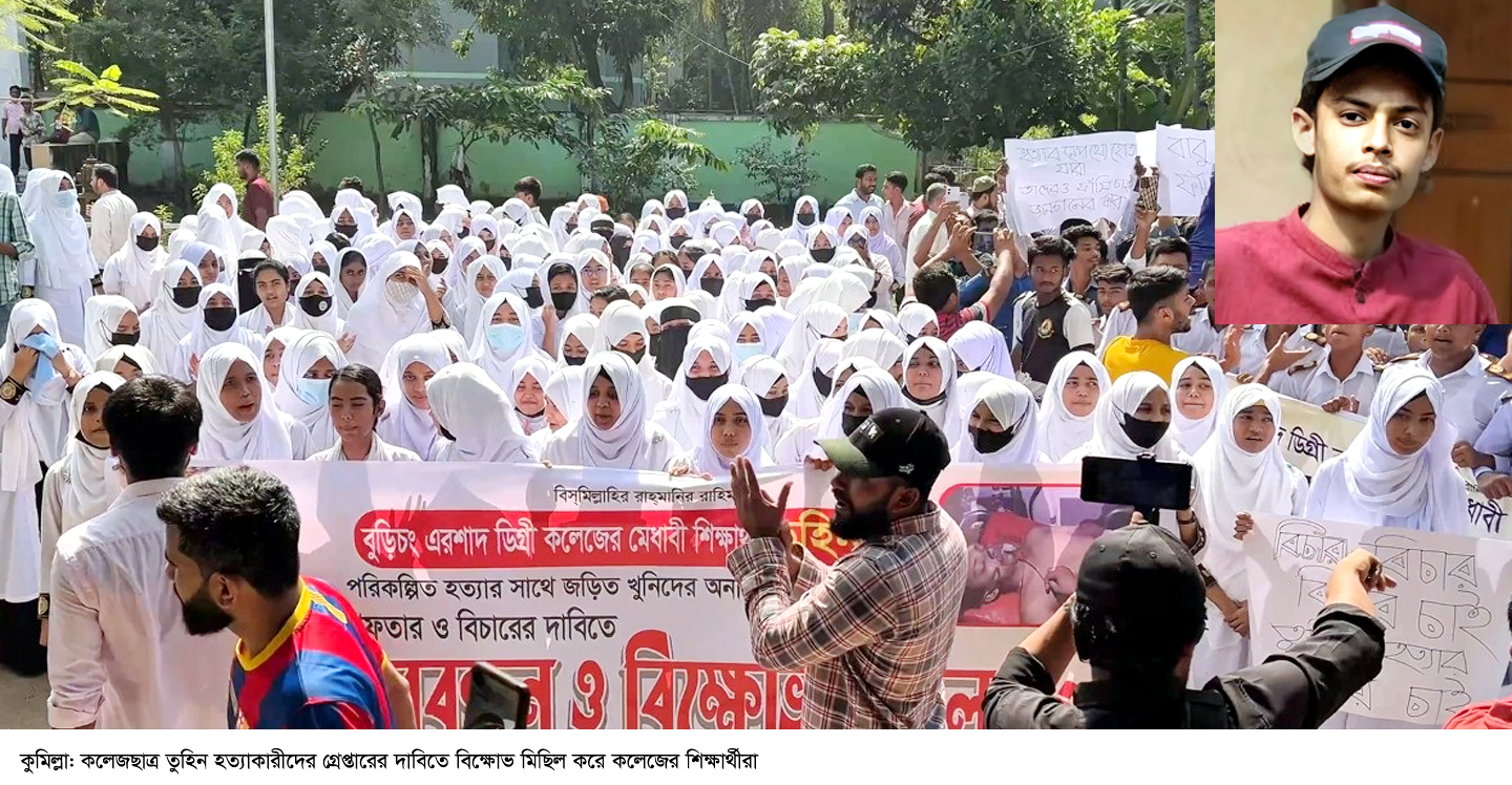 কুমিল্লায় কলেজছাত্র মো. তুহিন হত্যাকারীদের গ্রেপ্তার ও শাস্তির দাবিতে শিক্ষার্থীরা বিক্ষোভ মিছিল ও মানববন্ধন করেছে। মঙ্গলবার জেলার বুড়িচং উপজেলার এরশাদ ডিগ্রি কলেজের শিক্ষার্থী ও তাদের অভিভাবকসহ এলাকাবাসী উপজেলা সদরে এ কর্মসূচি পালন করে। হত্যাকাণ্ডের শিকার তুহিন ওই কলেজের দ্বাদশ শ্রেণির ছাত্র এবং ওই উপজেলার বাহেরচর গ্রামের মোসলেম উদ্দিনের ছেলে।