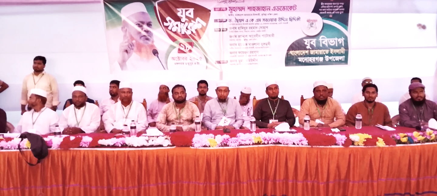 “দ্বীন কায়েমের পথে দৃপ্ত শপথ এগিয়ে চলি সদা হৃদয়ে মেখে, শত বাধা মাড়িয়ে আনবো আবার সোনালী সমাজ এই ধরার বুকে” এ প্রতিপাদ্যকে সামনে রেখে কুমিল্লার জামায়াতে ইসলামী মনোহরগঞ্জ উপজেলা যুব বিভাগের উদ্যোগে অনুষ্ঠিত হয়েছে যুব সমাবেশ। ২৮ অক্টোবর মঙ্গলবার বিকালে উপজেলা জামায়াতে ইসলামীর অফিস সংলগ্ন বালুর মাঠে এ সমাবেশ অনুষ্ঠিত হয়।