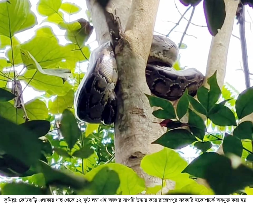 কুমিল্লায় ১২ ফুট লম্বা এক অজগর সাপ উদ্ধার করেছে বন বিভাগ। শনিবার দুপুরে কুমিল্লার কোটবাড়ির আনসার ক্যাম্প এলাকা থেকে সাপটি উদ্ধার করা হয়। পরে কুমিল্লার সদর দক্ষিণ উপজেলার রাজেশপুর ইকো পার্কের গহীন জঙ্গলে সাপটিকে অবমুক্ত করা হয়। বিষয়টি নিশ্চিত করেছেন রাজেশপুর ইকো পার্কের রেঞ্জ অফিসার হুমায়ুন কবীর ও কুমিল্লার কোটবাড়ি রেঞ্জ অফিসার এ কে এম লুৎফুল্লাহ।