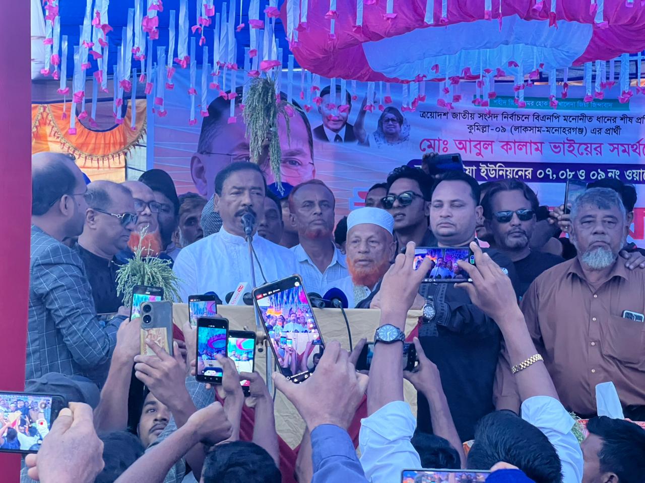 আবুল কালাম বলেন, আমাদের ভারপ্রাপ্ত চেয়ারম্যান জনাব তারেক রহমান আমাকে লাকসাম এবং মনোহরগঞ্জের মনোনয়ন দিয়েছেন। ফ্যাসিস্ট সরকারের বিগত সময়ের নির্যাতন, মামলা-হামলার কথা বিবেচনা করেই আমার দল আমাকে মনোনয়ন দিয়েছে। আমাকে আমার ভারপ্রাপ্ত চেয়ারম্যান জনাব তারেক রহমান বলেছেন, ভোগই হাই স্কুল মাঠে গিয়ে আমার সালাম দাও, ধানের শীষের সালাম দাও। আমি জনাব তারেক রহমানের পক্ষে আপনাদেরকে সালাম দেওয়ার জন্য এখানে এসেছি। আপনারা যেন তারেক রহমানকে আগামী নির্বাচনে প্রধানমন্ত্রী বানাবেন এটা আশা করি।