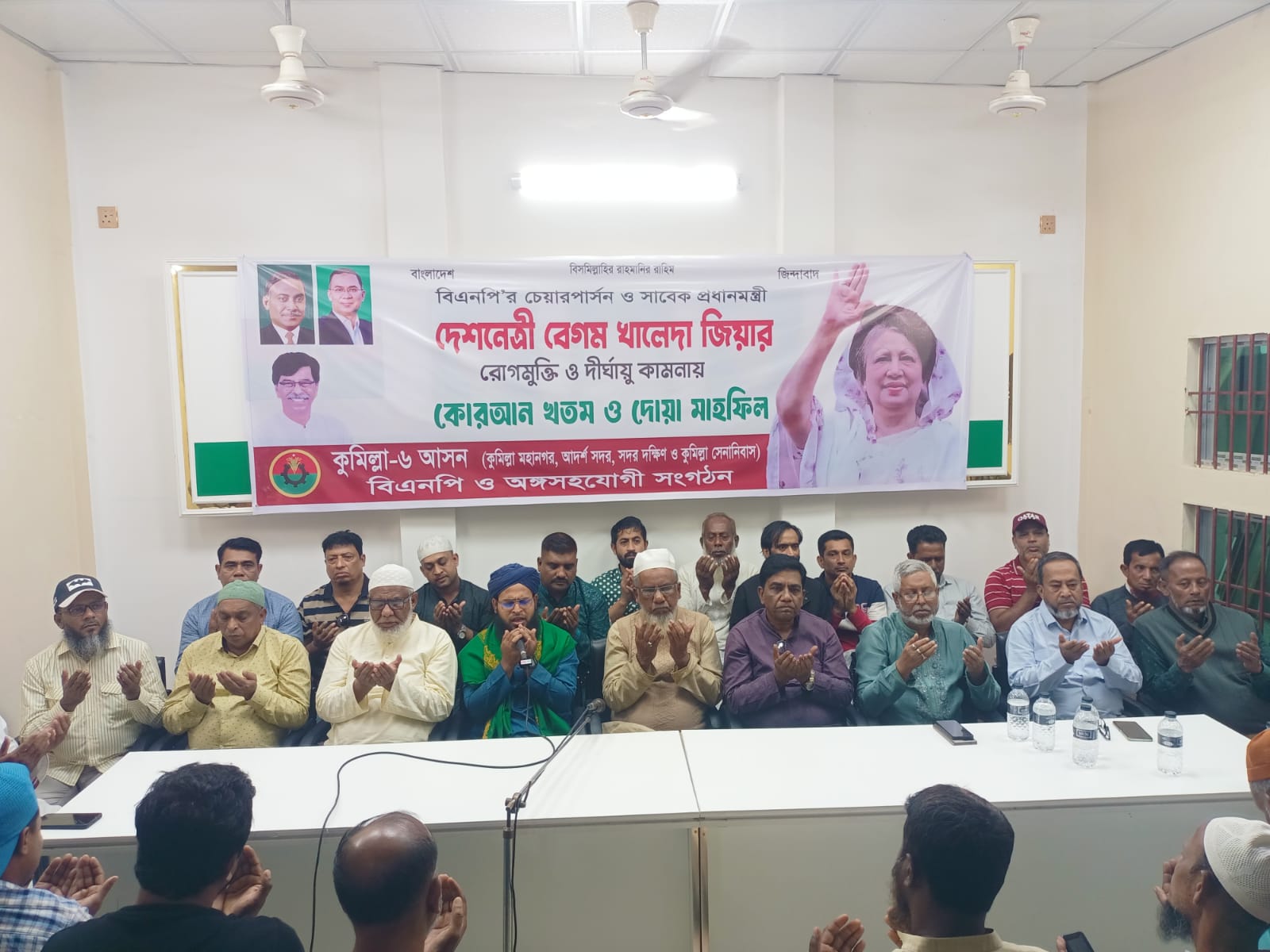 সাবেক প্রধানমন্ত্রী ও বিএনপির চেয়ারপার্সন বেগম খালেদা জিয়ার দ্রুত আরোগ্য ও রোগমুক্তি কামনায় কুমিল্লায় কোরআন খতম ও দোয়া মাহফিল অনুষ্ঠিত হয়েছে।