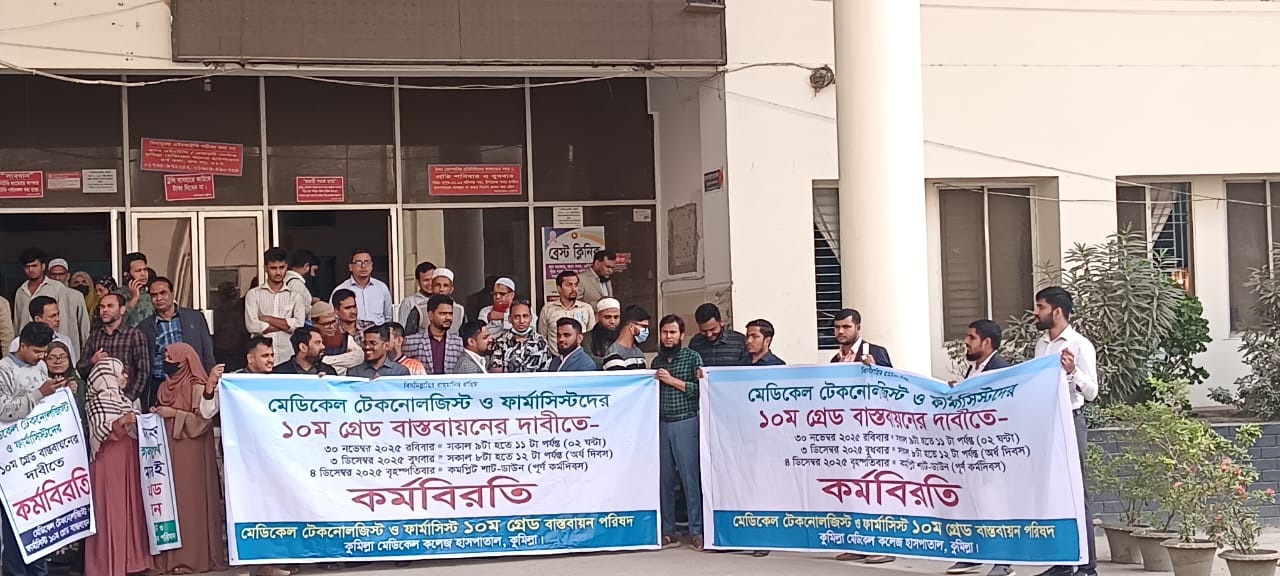 কুমিল্লায় ১০ম গ্রেডে পদোন্নতির দাবিতে টেকনোলজিস্ট ও ফার্মাসিস্ট অর্ধ দিবস কর্মবিরতী পালন করেছেন।
