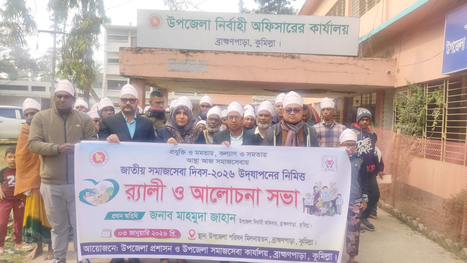 প্রযুক্তি ও মমতায়, কল্যাণ ও সমতায়—আস্থা আজ সমাজসেবায়”—এই স্লোগানকে ধারণ করে কুমিল্লার ব্রাহ্মণপাড়া উপজেলায় জাতীয় সমাজসেবা দিবস -২০২৬ উদযাপনের নিমিত্ত উপলক্ষে র্যালি ও আলোচনা সভা অনুষ্ঠিত হয়েছে।