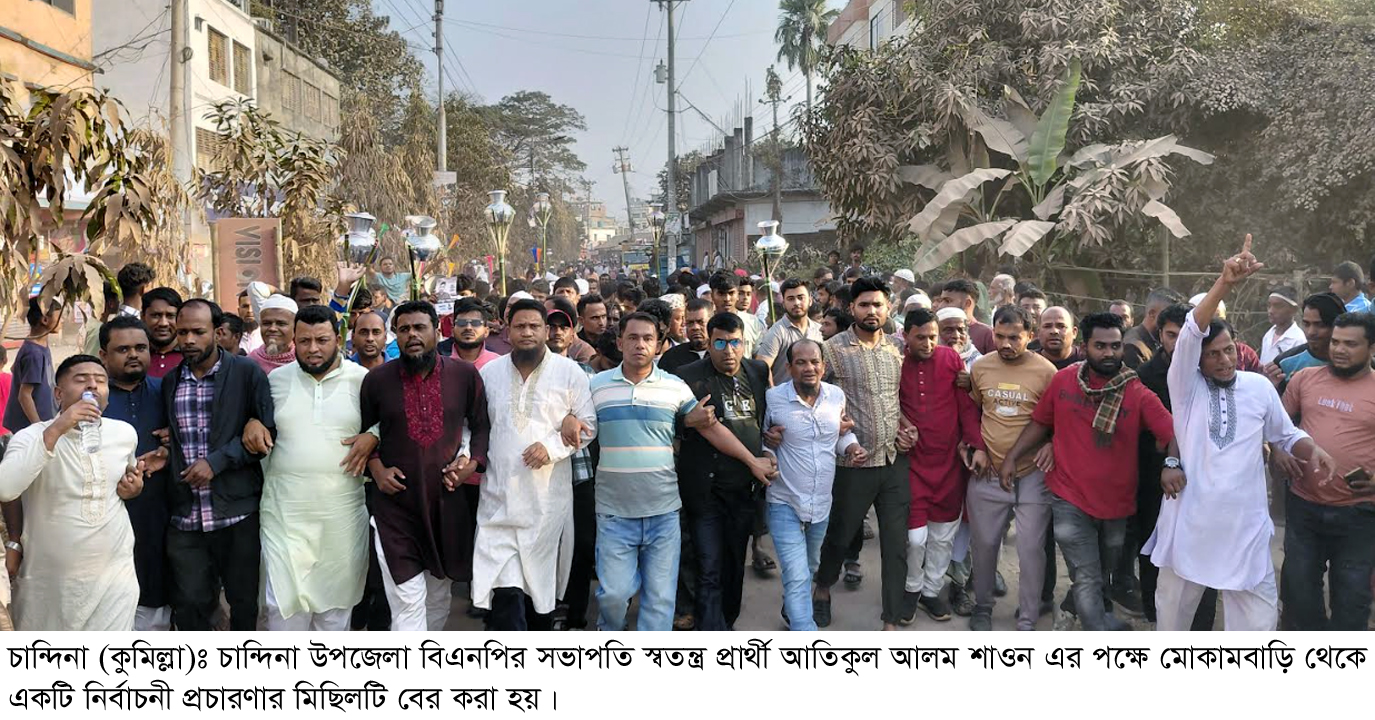 শুক্রবার (২৩ জানুয়ারি) বিকেলে চান্দিনা উপজেলা বিএনপির সভাপতি আতিকুল আলম শাওন এর পক্ষে মোকামবাড়ি থেকে একটি প্রচার মিছিলটি বের করা হয়। মিছিলটি ঢাক-চট্টগ্রাম মহাসড়ক হয়ে বেলাশ্বর দিয়ে বিভিন্ন গুরুত্বপূর্ণ সড়ক প্রদক্ষিণ করে।