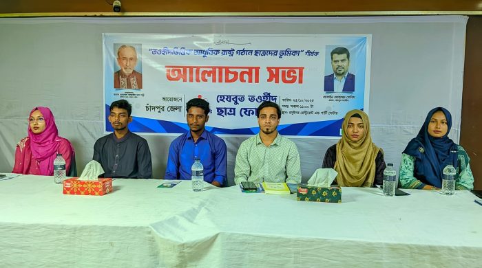 মো. আবদুল্লাহ, চাঁদপুর চাঁদপুরে তওহীদ ভিত্তিক আধুনিক রাষ্ট্র গঠনে ছাত্রদের ভূমিকা শীর্ষক এক প্রাণবন্ত আলোচনা সভা অনুষ্ঠিত হয়েছে। জেলা হেযবুত তওহীদ ছাত্রফোরামের আয়োজনে ২৫ অক্টোবর শনিবার সকাল ১১টায় শহরের রসুইঘর রেস্টুরেন্ট অ্যান্ড পার্টি সেন্টারে এ আলোচনা সভা অনুষ্ঠিত হয়। কুমিল্লা আঞ্চলিক ছাত্রফোরামের সাহিত্য সম্পাদক অনামিকা তাপসীর সঞ্চালনায় অনুষ্ঠানে সভাপতিত্ব করেন চাঁদপুর জেলা হেযবুত তওহীদ ছাত্রফোরামের