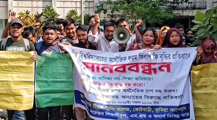নিজস্ব প্রতিবেদক জাতীয় বিশ্ববিদ্যালয়ের অধীনে ফরম পূরণসহ অন্যান্য ফি বৃদ্ধির প্রতিবাদে কুমিল্লা মানববন্ধন করেছেন শিক্ষার্থীরা। রবিবার (২৬ অক্টোবর) দুপুরে কুমিল্লা সরকারি টিচার্স ট্রেনিং কলেজে মানববন্ধন করেন ছাত্রছাত্রীরা। এর পূর্বে অধ্যক্ষের মাধ্যমে বিশ্ববিদ্যালয়ে স্মারকলিপি পাঠান তারা। তাদের দাবি, ফি কমানো হলে ফরম ফিলাপ করবেন, নইলে করবেন না। মানববন্ধনে অনার্স ও বিএড শ্রেণির অর্ধশত শিক্ষার্থী অংশগ্রহণ করে।