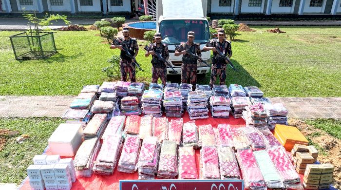 নিজস্ব প্রতিবেদক কুমিল্লার সীমান্ত থেকে এক কোটি ৭৪ লাখ টাকা মূল্যের ভারতীয় শাড়ি, মোবাইলের ডিসপ্লেসহ বিপুল পরিমাণ চোরাচালান পণ্য জব্দ করেছে বর্ডার গার্ড বাংলাদেশ (বিজিবি)। বুধবার বিকেল ৪টায় বিষয়টি নিশ্চিত করেছেন কুমিল্লা ব্যাটালিয়ন (১০ বিজিবি) এর অধিনায়ক লেফটেন্যান্ট কর্নেল মীর আলী এজাজ। লেফটেন্যান্ট কর্নেল মীর আলী এজাজ জানান, কুমিল্লা ব্যাটালিয়ন (১০ বিজিবি) নিয়মিতভাবে সীমান্ত এলাকায়
