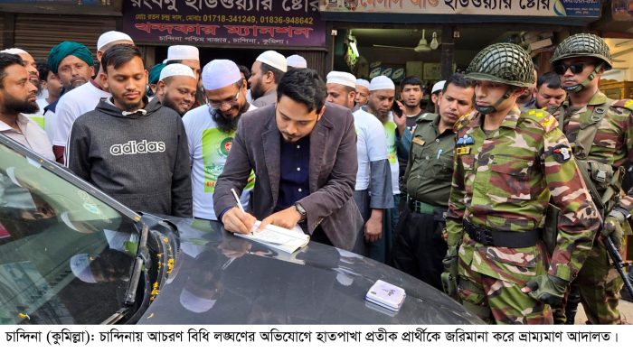 প্রতিনিধি, চান্দিনা | কুমিল্লার চান্দিনায় নির্বাচনী প্রতীক পেয়েই শোডাউন করার অভিযোগে ইসলামী আন্দোলন বাংলাদেশ প্রার্থীকে জরিমানা করেছে ভ্রাম্যমাণ আদালত। বুধবার (২১ জানুয়ারী) বিকেলে চান্দিনা পশ্চিম বাজারস্থ ইসলামী আন্দোলন বাংলাদেশ উপজেলা শাখার কার্যালয় সংলগ্ন এলাকায় ভ্রাম্যমাণ আদালত এর সামনে পড়ে শোডাউনটি। এতে হাত পাখা প্রতীকের ইসলামী আন্দোলন বাংলাদেশ প্রার্থী মাও. এহতেশামুল হক কাসেমীকে নগদ ৩০ হাজার