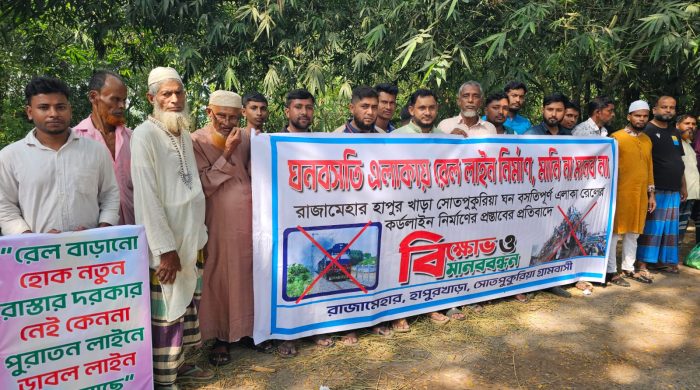 মাহফুজ আহম্মেদ, দেবিদ্বারঃ কুমিল্লার দেবিদ্বারে গ্রামের ভেতর দিয়ে রেললাইন নির্মাণের প্রতিবাদে মানববন্ধন কর্মসূচি পালিত হয়েছে। শুক্রবার (২৪ অক্টোবর) সকাল সাড়ে ১০টার দিকে উপজেলার গুনাইঘর দক্ষিণ ইউনিয়নের হাফুরখাড়া গ্রামে এ মানববন্ধন অনুষ্ঠিত হয়। মানববন্ধনে হাপুরখাড়া, রাজামেহার ও সোতপুকুরিয়া এই তিন গ্রামের প্রায় পাঁচ শতাধিক নারী-পুরুষ অংশ নিয়ে রেল প্রকল্পের এই ‘অমানবিক সিদ্ধান্তের’ তীব্র প্রতিবাদ জানায়। বক্তারা