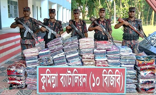 নিজস্ব প্রতিবেদক কুমিল্লার সীমান্ত এলাকায় অভিযান চালিয়ে এক কোটি ১৫ লাখ ৫১ হাজার টাকা মূল্যের ভারতীয় পোশাকসামগ্রী ও মোবাইল ডিসপ্লে জব্দ করেছে বর্ডার গার্ড বাংলাদেশ (বিজিবি)। আজ রোববার ভোরে চৌদ্দগ্রাম ও আদর্শ সদর উপজেলার সীমান্ত এলাকায় অভিযান চালায় বিজিবি। বিজিবির প্রেস বিজ্ঞপ্তিতে জানানো হয়, শিবেরবাজার ও কটকবাজার সীমান্তে পৃথক টহলে ৩২৩ পিস ভারতীয় শাড়ি, ১৮০