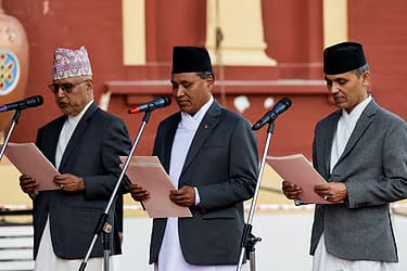 অনলাইন ডেক্স মন্ত্রী হিসেবে শপথ নিচ্ছেন ডান থেকে কুলমান ঘিসিং, ওম প্রকাশ আর্যাল ও রমেশ্বর খানাল। ১৫ সেপ্টেম্বরছবি: রয়টার্স নেপালে অন্তর্বর্তী সরকারের নতুন প্রধানমন্ত্রী সুশীলা কারকি প্রথমবারের মতো তাঁর মন্ত্রিসভার তিন সদস্যের নাম ঘোষণা করেছে। আজ সোমবার তিনজন মন্ত্রী হিসেবে শপথ নিলেন। তরুণদের নেতৃত্বে দুর্নীতিবিরোধী আন্দোলনে উত্তাল দেশটিতে এখন শৃঙ্খলা ফিরিয়ে আনার চেষ্টা চলছে। বিক্ষোভকারীদের