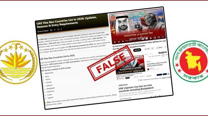 অনলাইন ডেক্স। বাংলাদেশসহ ৯ দেশের ওপর ভিসা নিষেধাজ্ঞা আরোপ করেছে সংযুক্ত আরব আমিরাত- শনিবার এমনই খবর প্রকাশ করে বাংলাদেশি গণমাধ্যমগুলো। তবে এই খবর সত্য নয় বলে জানিয়েছে অন্তর্বর্তীকালীন সরকারের প্রেস উইংয়ের ভেরিফায়েড ফেসবুক পেজ সিএ প্রেস উইং ফ্যাক্টস (CA Press Wing Fac। শনিবার (২০ সেপ্টেম্বর) দিবাগত রাতে এক পোস্টে সিএ প্রেস উইং ফ্যাক্টস জানিয়েছে,