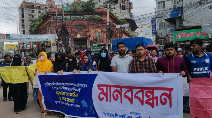 কুবি প্রতিনিধি কুমিল্লা বিশ্ববিদ্যালয়ের লোক প্রশাসন বিভাগের ২০২১–২২ শিক্ষাবর্ষের শিক্ষার্থী সুমাইয়া আফরিন ও তার মায়ের নৃশংস হত্যা এবং ধর্ষণের ঘটনায় দ্রুত ও সুষ্ঠু বিচার ও দোষীর ফাঁসির দাবিতে শিক্ষার্থীরা সোমবার (১৫ সেপ্টেম্বর) দুপুরে তৃতীয়বারের মতো মানববন্ধন ও বিক্ষোভ মিছিল করেছে। দুপুর ১টায় কুমিল্লার কান্দিরপাড়ের পূবালী চত্বরে প্রথমে মানববন্ধন অনুষ্ঠিত হয়। এরপর বিক্ষোভ মিছিল নিয়ে তারা